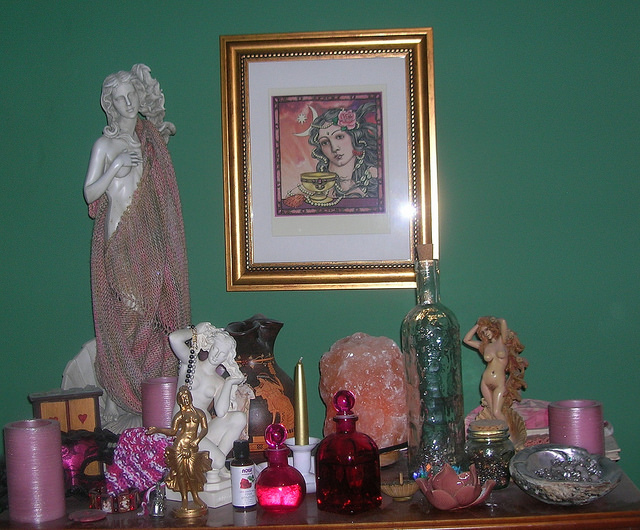 I keep a blessing bottle on my home altar to Aphrodite. It holds little folded-paper hearts, like so:
