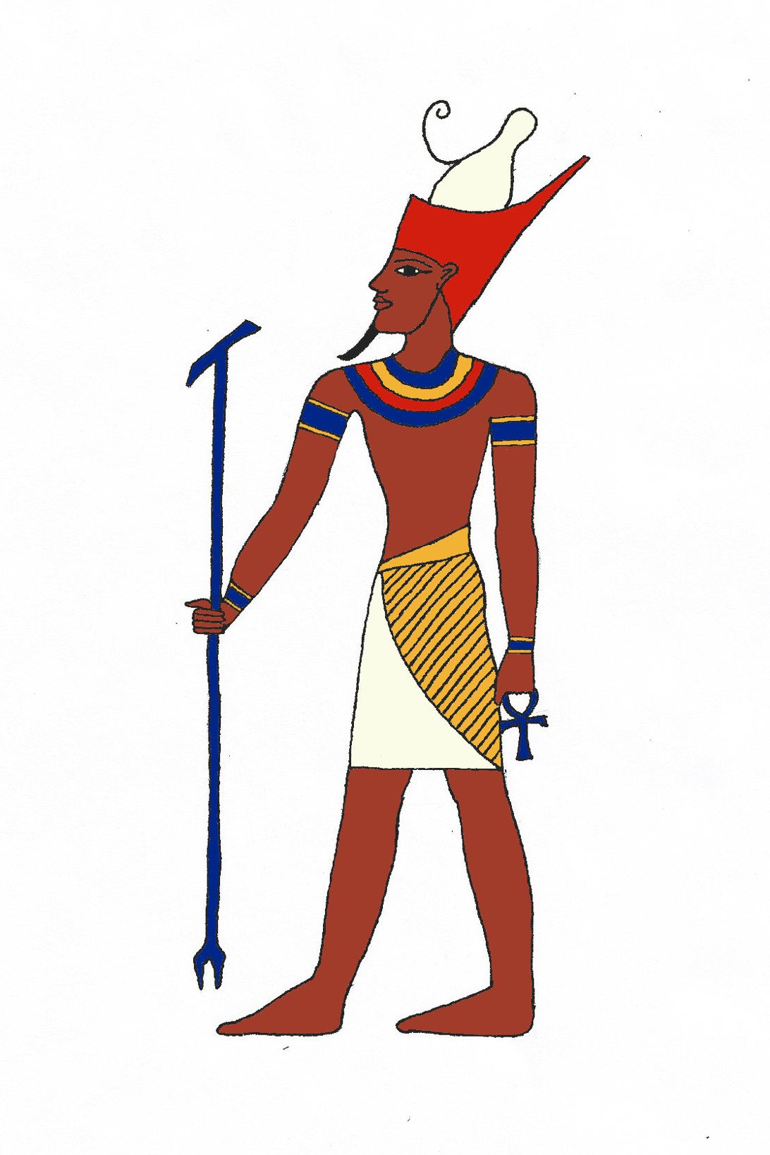 Atum is depicted here wearing the double crown of Upper and Lower Egypt. He carries the was staff, a symbol of power, in one hand and the ankh, a symbol of life, in the other.