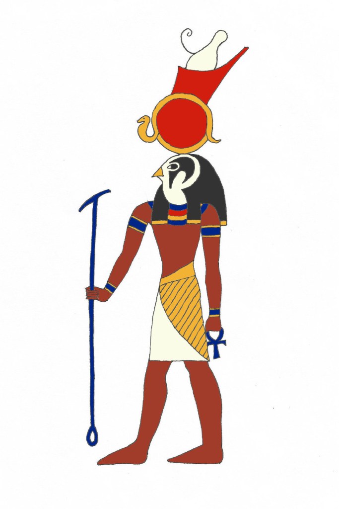 He is depicted here as a man with the head of a hawk, wearing the solar disk with uraeus snake and the double crown (pschent) of Upper and Lower Egypt. He carries the was staff, a symbol of power, in one hand and the ankh, a symbol of life, in the other.