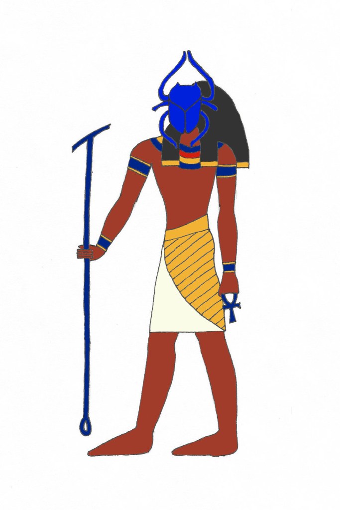 Khepera is depicted here as a man with a scarab beetle for a head. He carries the was staff, a symbol of power, in one hand and the ankh, a symbol of life, in the other.