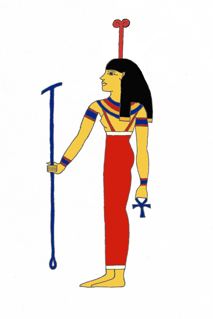 Meskhenet is depicted here with her unique characteristic headdress–a cow’s uterus, symbolizing her connection with birth. She can also be depicted as a brick with a woman’s head and that same headdress–these bricks were women traditionally used by women to squat on while giving birth.