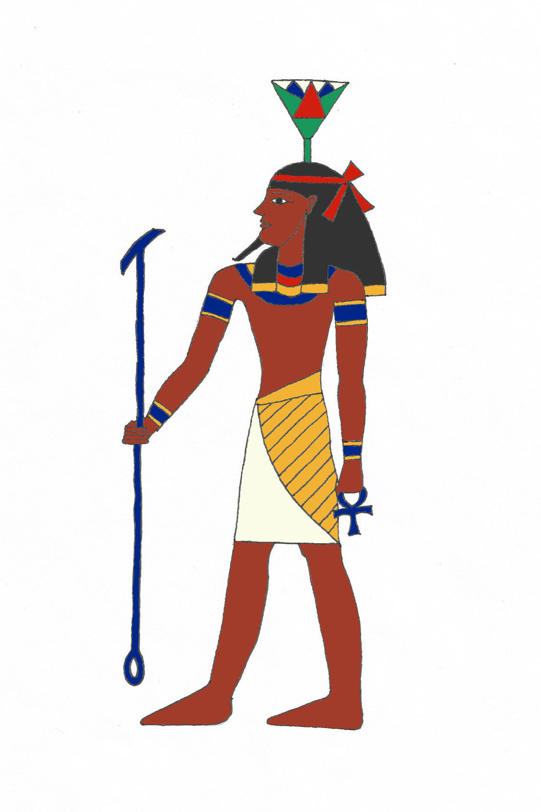 Nefertem is depicted here with a lily on his head. He carries the was staff, a symbol of power, in one hand and the ankh, a symbol of life, in the other.