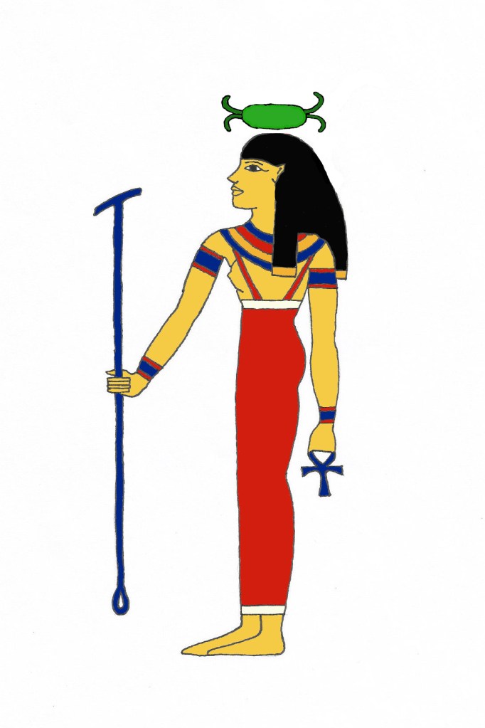 Neith is depicted here with her particular headdress, a shield representing her strength as a protector; it may also depict a shuttle, which would be appropriate for a weaving goddess. She carries the was staff, a symbol of power, in one hand and the ankh, a symbol of life, in the other.