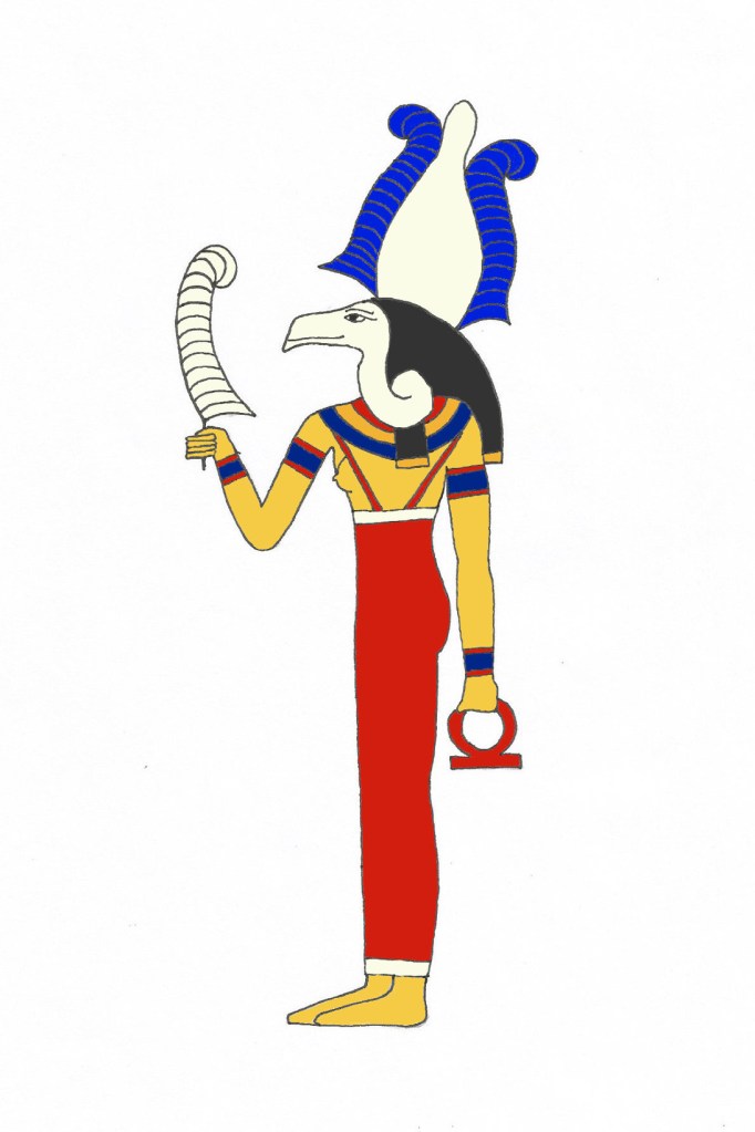 Nekhbet is depicted here as a woman with the head of a vulture, wearing the white crown of Upper Egypt. She carries the feather of Ma’at, a symbol of truth, in one hand and the shen, a symbol of eternity, in the other.