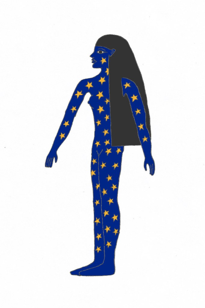 Nut is depicted here with deep blue skin, long black hair, her body covered in stars. She is frequently depicted in this form in art, lying far above Geb, as the sky lies above the earth.