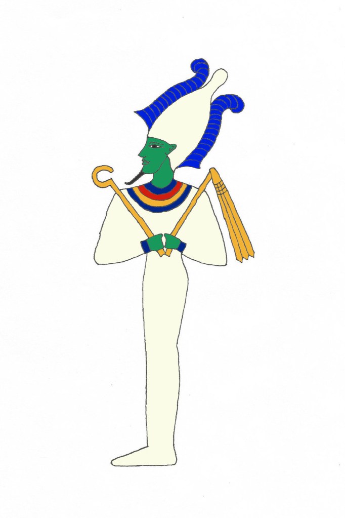 Osiris is depicted here with green skin, representing rebirth and resurrection. He is wrapped in white like a mummy and carries the crook (symbolizing sovereignty) and flail (symbolizing fertility). He wears the atef crown that is uniquely his, consisting of the white crown (hedjet) of upper Egypt between two ostrich feathers; the ostrich feather is the symbol of Ma’at, goddess of truth and order