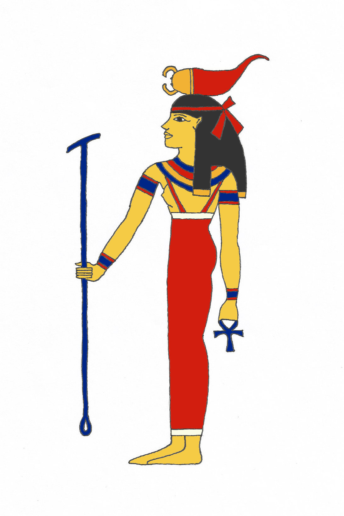 Serqet is depicted here with a scorpion on her head. She carries the was staff, a symbol of power, in one hand and the ankh, a symbol of life, in the other.