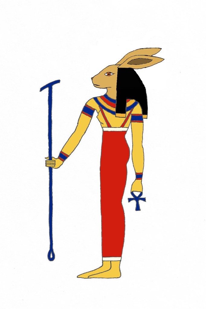Wenut is an Egyptian goddess associated with fertility and the birth of children and animals. She is depicted here as a woman with the head of a hare; she may also be shown in the full form of a hare.